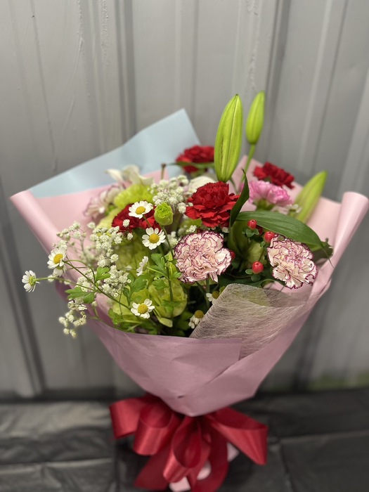 花材:康乃馨.百合花.桔梗花.洋甘菊.火龍果.滿天星
