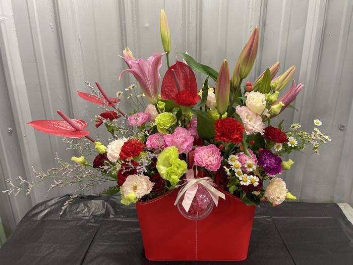 花材:康乃馨.桔梗花.百合花.火鶴.卡斯比亞.洋甘菊.火紅果